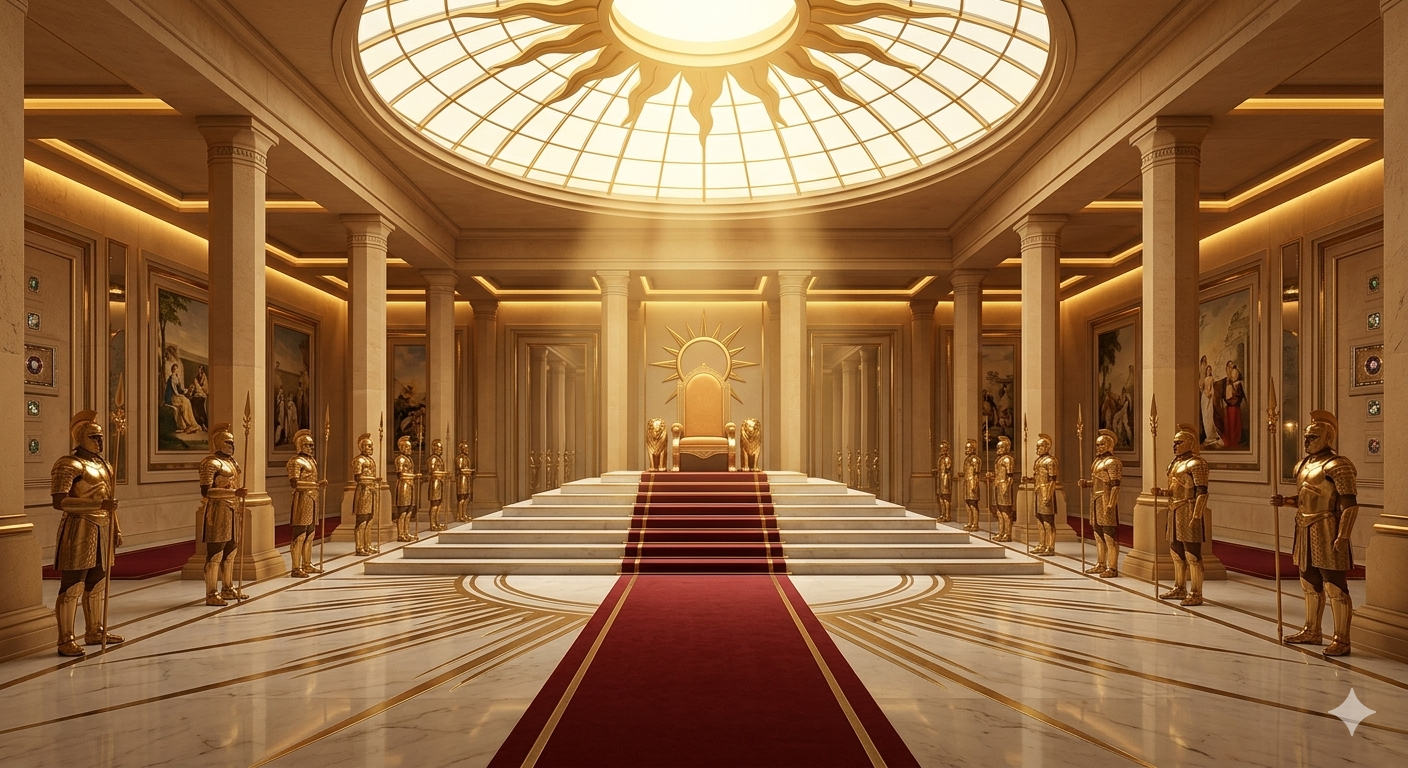 A rich red carpet leads to it, bordered by subtle golden trims, while the elite guards stand in perfectly aligned formation,